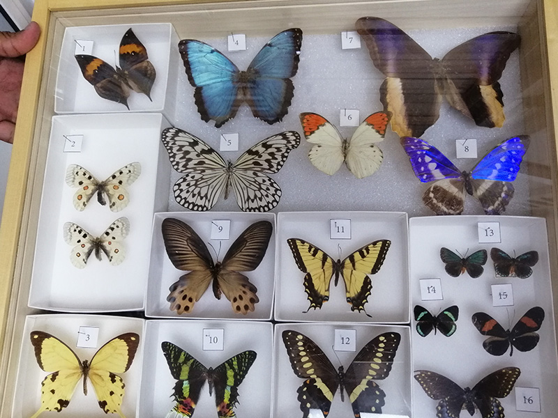 Dentro de los especímenes que guardan están escarabajos, mariposas, mosquitos, mariquitas, grillos, saltamontes, abeja, chinche, cada uno acompañado de una etiqueta que indica donde fue colectado el animal, en qué fecha, quién lo colectó y el espacio o lugar donde fue hallado.