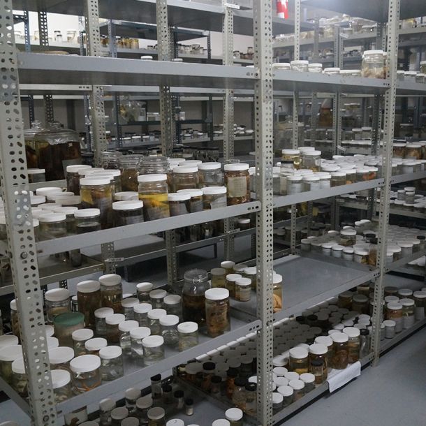 En este depósito están los organismos o animales que se preservan en estos dos componentes, entre ellos anfibios, reptiles, algunas aves, peces, especies de arácnidos, equinodermos (de los grupos de las estrellas de mar, erizos), y otros. En ese espacio se guarda la colección más grande de vertebrados que tiene el museo.